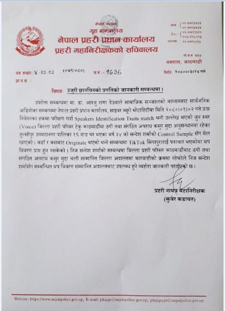 आइतबार प्रहरी प्रधान कार्यालय, नक्सालले विज्ञप्ति जारी गरी कांग्रेस नेतृ देउवाको नाम जोडेर सामाजिक सञ्जालमार्फत सार्वजनिक भएको अडियोमा ठगी तथा संगठित अपराध कसुर मुद्दामा अनुसन्धानमा रहेका तुलसीपुर उपमहानगरपालिका-१६ का ३४ वर्षीय सन्देश शर्माको आवाजसँग मेल खाएको बताएको छ ।