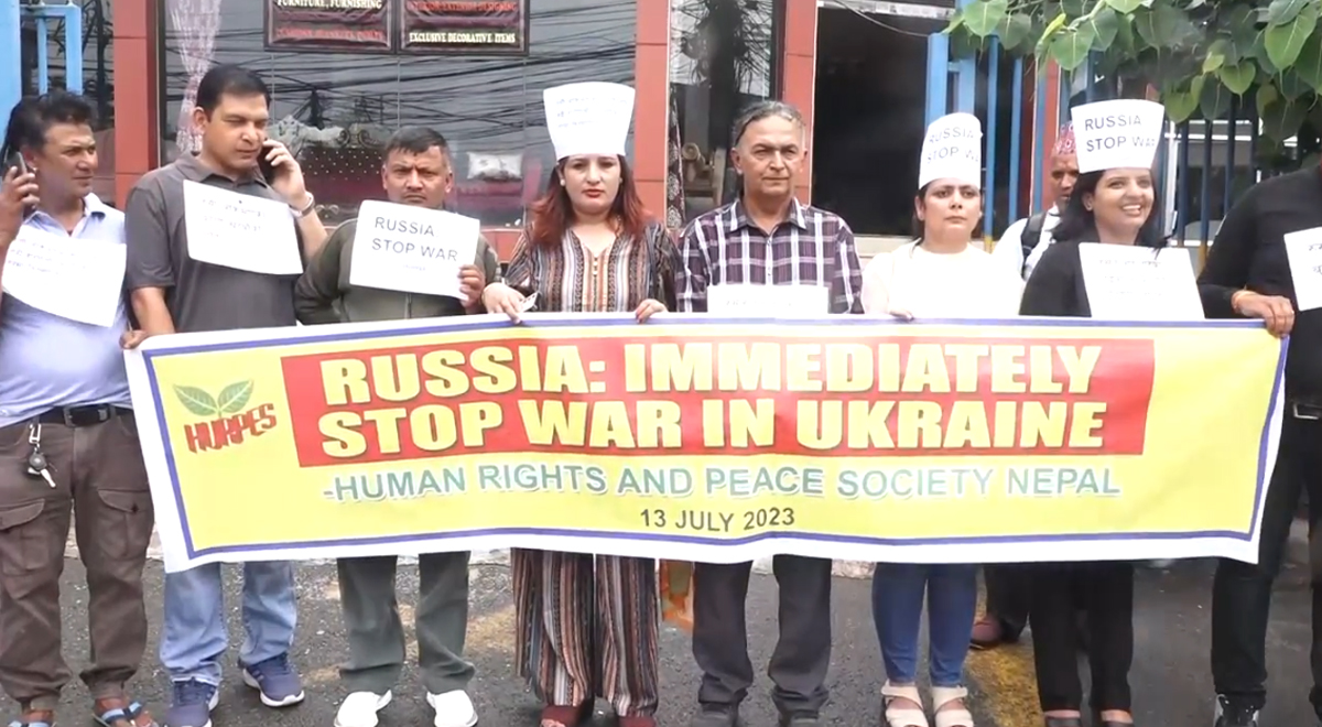 रुस–युक्रेन युद्धको ५०५ औँ दिन पुग्दा पनि युद्ध नरोकिएको भन्दै समाजले युद्ध रोक्न आग्रह गर्दै रुसी दुतावास अगाडि प्रदर्शन गरेको हो । प्रदर्शनमा सहभागीहरुले रुसः तत्काल युद्ध अन्त्य गर, युद्धको ५०५ दिनः मानवता पराजित, रुसी आक्रमण बन्द गर, युद्धको ५०५ दिनः इतिहास लज्जित, रुसी आक्रमणका कारण हजारौ नागरिकको मृत्यु, मानवता पराजित हुँदैछ लगायतका प्लेकार्ड प्रदर्शन गरेका थिए ।