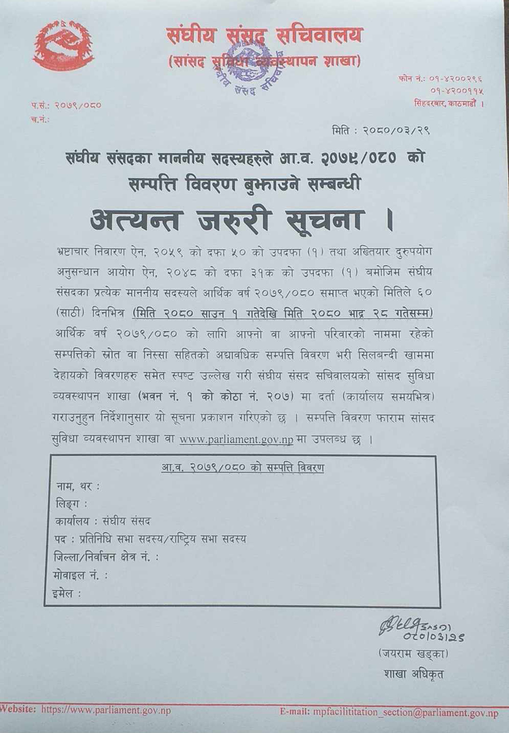 सोही व्यवस्थाअनुसार सचिवालयलले सांसदहरूलाई सम्पत्ति विवरण बुझाउन भनेको हो ।