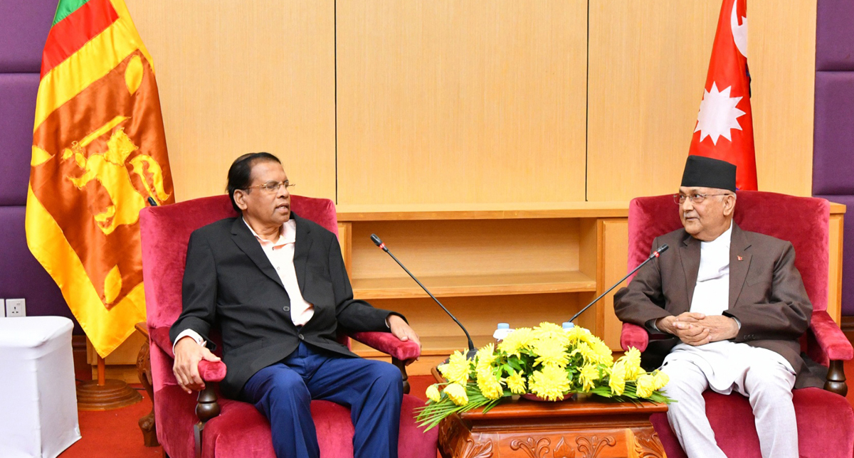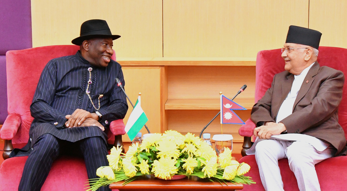 काठमाडौँ । नेकपा (एमाले)का अध्यक्ष केपी शर्मा ओलीले श्रीलङ्का पूर्वराष्ट्रपति मैत्रीपाला सिरिसेना र नाइजेरियाका पूर्वराष्ट्रपति गुडलक जोनाथनसँग शिष्टाचार भेटवार्ता गरेका छन् ।