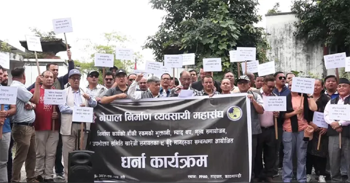 आईतवार निर्माण व्यवसायीहरुले सरकारले आयोजनाहरुको म्याद थपको आदेश र भुक्तानी लगायतका विषयलाई लिएर सार्वजनिक खरिद अनुगमन कार्यालय ताहचलमा धर्ना दिएका हुन् । महासंघले सोमवार प्रधानमन्त्री निवास अगाडि सेफ्टी हेल्मेट र ज्याकेट लगाएर धर्ना दिने बताएको छ ।
