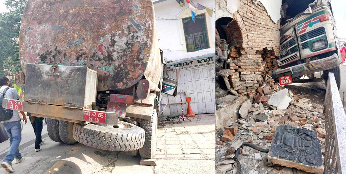 त्रिपुरेश्वरबाट भोटाहिटीतर्फ जाँदै गरेको ना २ क ४० नम्बरको ट्यांकर आज बिहान दुई बजेतिर मन्दिरको भित्तामा ठोक्किएको बताइएको छ ।