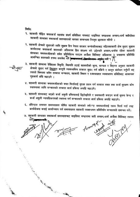 त्यस्तै सहकारी संस्थामा देखिएका विकृति, विसंगति हटाई सहकारीको मूल्य, मान्यता र सिद्दान्त अनुसार सहकारी क्षेत्रको सुधार गर्न विद्यमान कानुनी व्यवस्थाभित्र तत्काल सुधार गर्न सकिने र कानुन संशोधन गर्नुपर्ने भए त्यस्तो विषयमा समेत तत्काल मन्त्रालय, सहकारी विभाग र समस्याग्रस्त व्यवस्थापन समितिबाट आवश्यक गृहकार्य अघि बढाउने सहमति भएको छ।