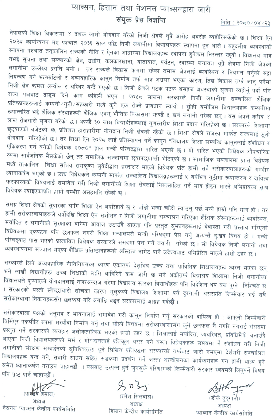 यस्तै, साउन २५ गते विद्यालय शिक्षा सम्बन्धी कानुनलाई संसोधन र एकीकरण गर्न बनेको मस्यौदाको विरोधमा अन्तरकृया गर्ने, २७ गते आन्दोलनको समिक्षा गर्ने कार्यक्रम छ ।