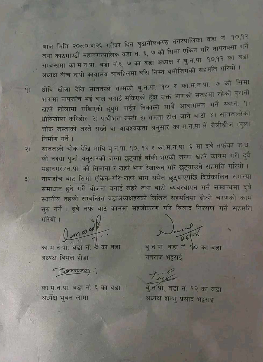 दुई पक्षबीचको सहमतिपछि बुढानिलकण्ठ नगरपालिका- १० र काठमाडौं महानगरपालिका- ७ को सीमानामा पर्ने खहरेखोला खुल्ला गर्न महानगरले डोजर चलाएको हो ।