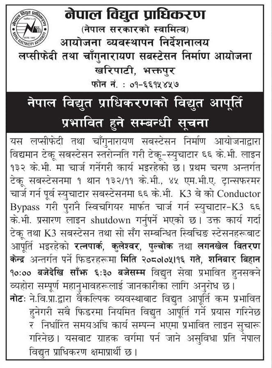 हाल टेकु सबस्टेसनको स्तरोन्नती गरी टेकु–स्युचाटार ६६ केभी लाइन १३२ केभीमा चार्ज गर्ने कार्य भइरहेकाले विद्युत आपूर्ति प्रभावित हुने प्राधिकरणले जनाएको छ ।