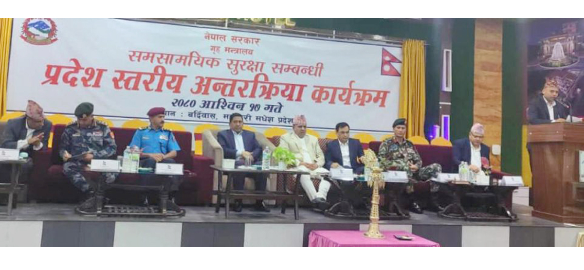उपप्रधानमन्त्री एवं गृहमन्त्री नारायणकाजी श्रेष्ठले मधेस प्रदेशको समसामयिक सुरक्षा चुनौतीबारे सुरक्षा अधिकारीहरुसँग अन्तरक्रिया गरेका हुन् । अन्तरक्रियामा आठै जिल्लाका प्रमुख जिल्ला अधिकारी र सबै सुरक्षा निकायका प्रदेश र जिल्ला प्रमुख सहभागी छन् ।