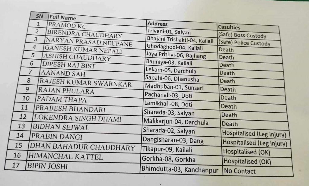 नेपाली दूतावासका अनुसार आक्रमणमा परी घाइते भएका छ जनाको विभिन्न अस्पतालमा उपचार भइरहेको छ । कञ्चनपुरको भीमदत्त नगरपालिका–३ का विपीन जोशी हराइरहेका छन् ।