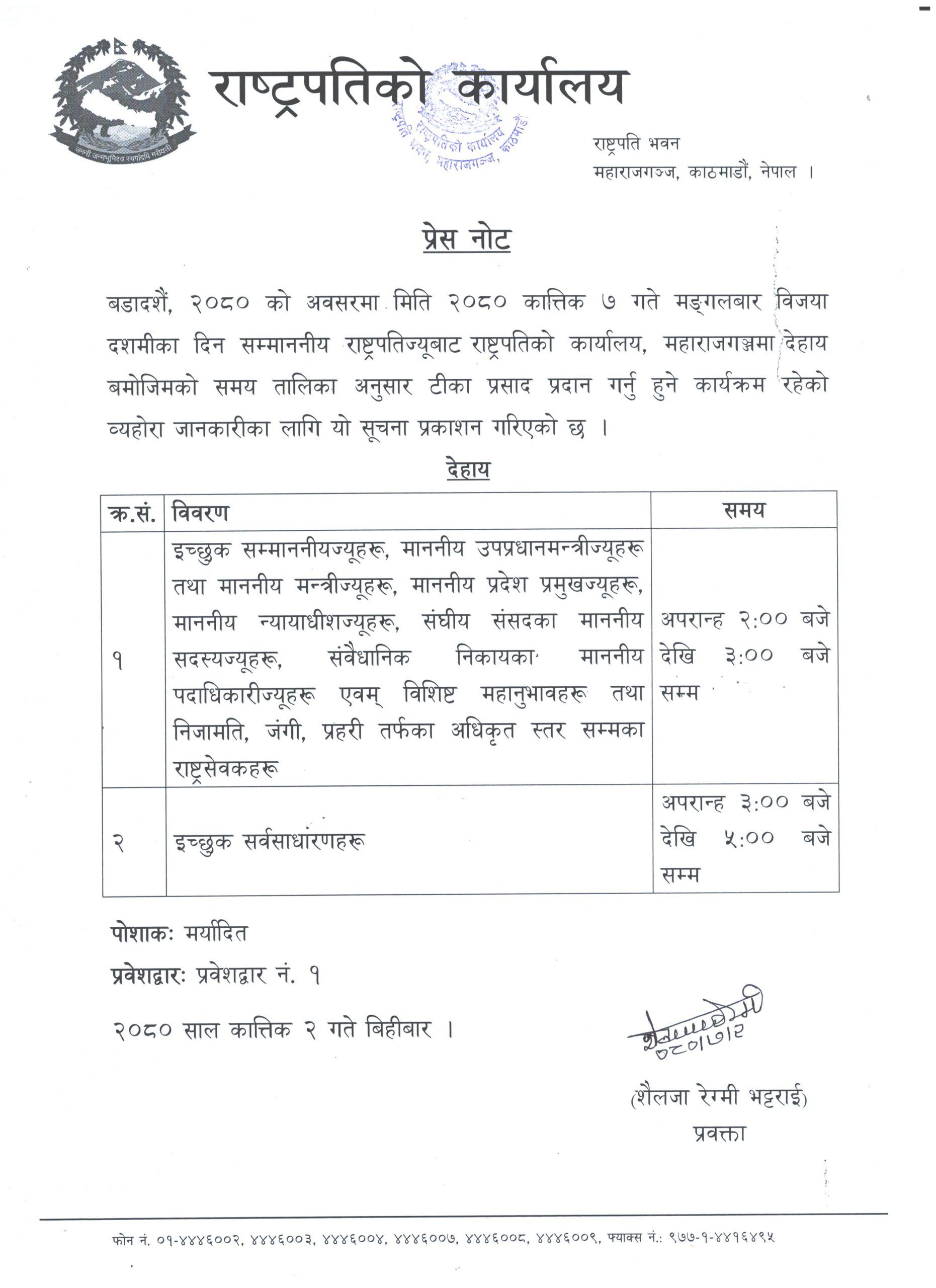 राष्ट्रपति कार्यालयले बिहीबार जारी गरेको सूचनाका अनुसार ७ कात्तिक मंगलबार विजया दशमीका दिन विशिष्ट व्यक्ति र सर्वसाधारणलाई टीका लगाइदिने हुनुभएको हो ।
