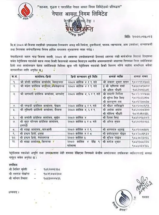 काठमाडौँ । दसैँको सार्वजनिक बिदाका दिनहरूमा पनि आयल निगमका बिक्री केन्द्र (डिपो)हरू खुला रहने भएका छन् ।