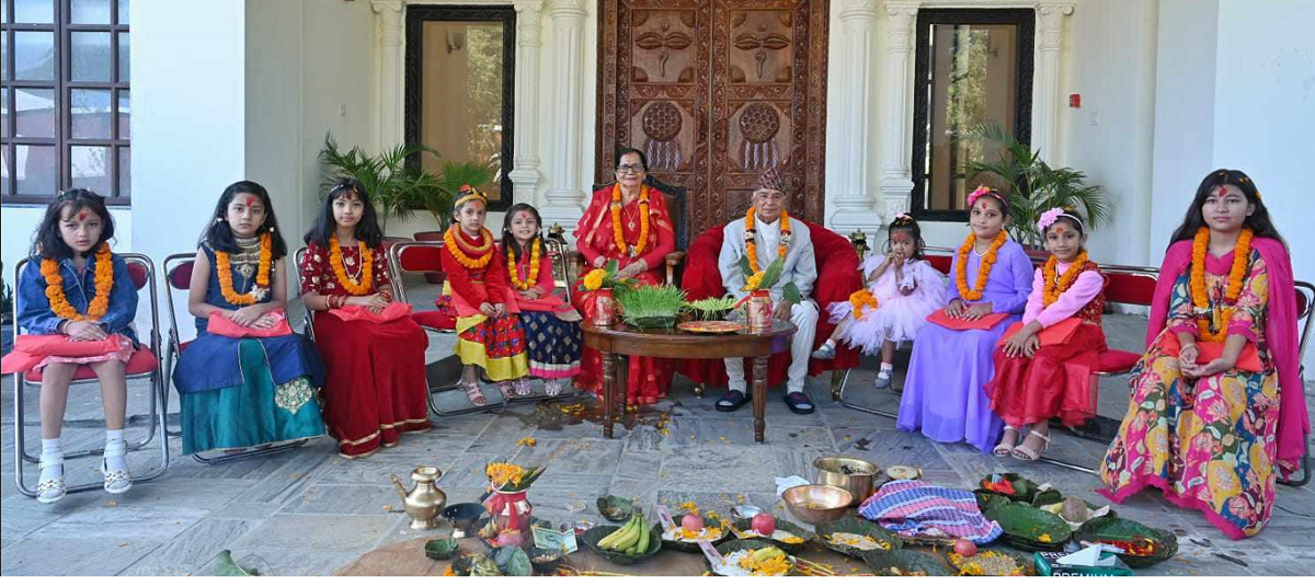सो अवसरमा राष्ट्रपति पौडेलले नवकन्याको गोडा धोएर, टीका लगाई, उपहार प्रदान गर्नुभयो । दसैँका अवसरमा महानवमीको दिनमा राष्ट्रप्रमुखले प्रत्येक वर्ष नवकन्याको पूजा गर्ने प्रचलन छ ।