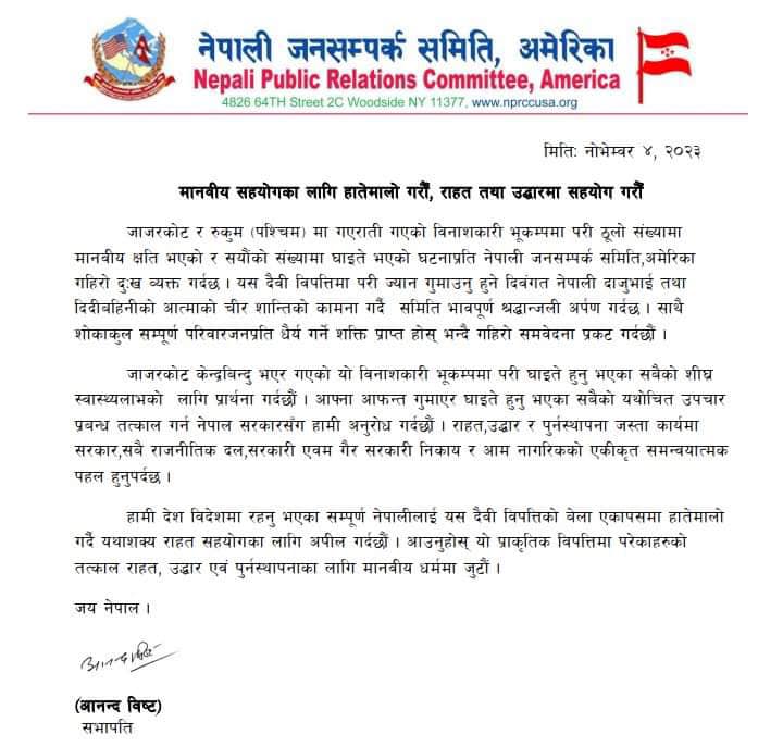 ‘जाजरकोट र रुकुम पश्चिममा गएको विनाशकारी भूकम्पमा परी ठूलो संख्यामा मानवीय क्षति भएको र सयौंको संख्यामा घाइते भएको घटनाप्रति नेपाली जनसम्पर्क समिति अमेरिका गहिरो दुःख व्यक्त गर्दछ। दैवी विपत्तिमा परी ज्यान गुमाउनु हुने दिवंगत नेपाली दाजुभाइ तथा दिदीबहिनीको आत्माको चीर शान्तिको कामना गर्दै समिति भावपूर्ण श्रद्धान्जली अर्पण गर्दछ,’ उनले जारी गरेको विज्ञप्तिमा भनिएको छ।