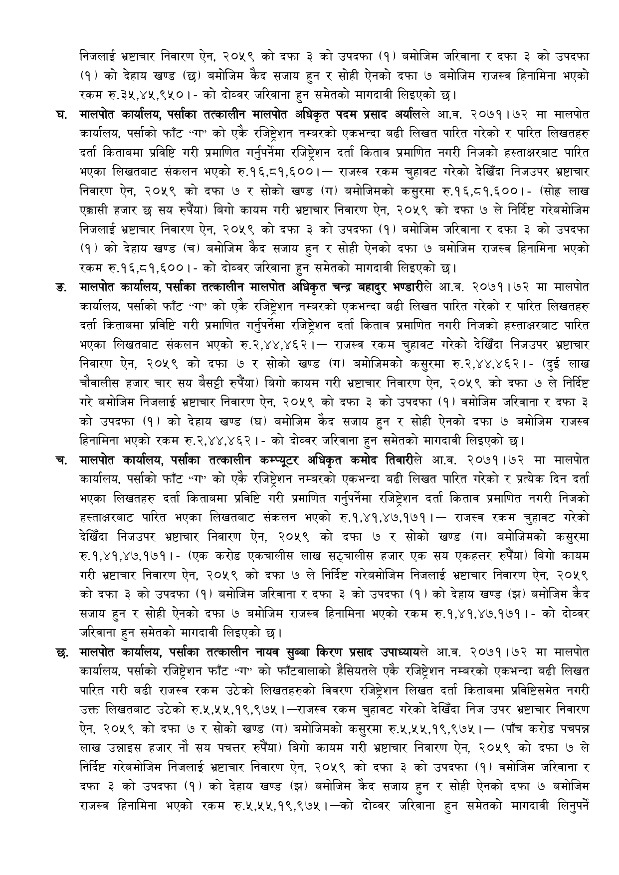 तत्कालीन मालपोत अधिकृतहरु भुपबहादुर बोगटीले १ करोड ४९ लाख ६९ हजार १ सय ३५ रुपैयाँ, गोपालबहादुर ढुंगानाले ३५ लाख ४५ हजार ९५० रुपैयाँ, तत्कालीन मालपोत अधिकृत पदमप्रसाद अर्यालले १६ लाख ८१ हजार ६०० रुपैयाँ र चन्द्रबहादुर भण्डारीले २ लाख ४४ हजार ४६२ रुपैयाँ हिनामिना गरेको आयोगको ठहर छ ।