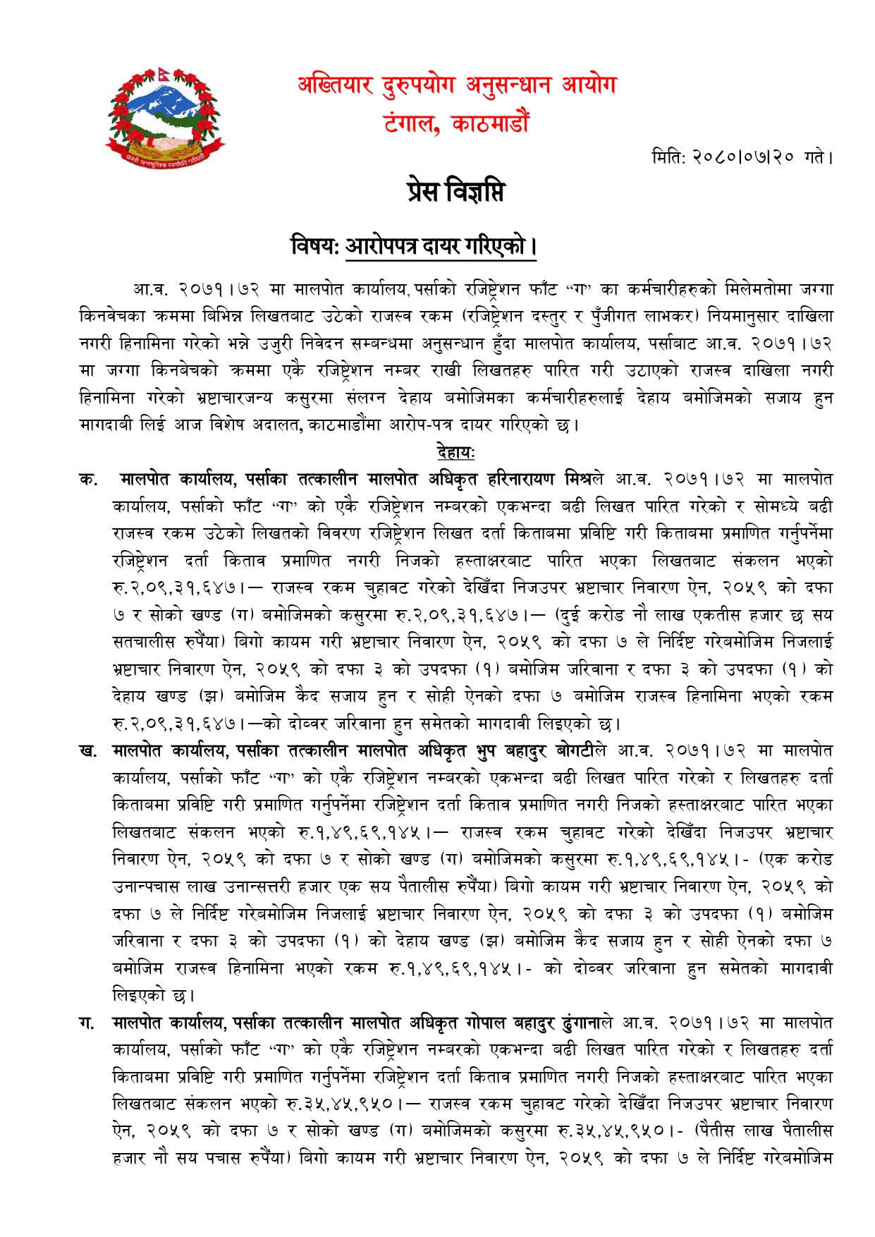 काठमाडौं । अख्तियार दुरुपयोग अनुसन्धान आयोगले पर्साका तत्कालीन मालपोत अधिकृत हरिनारायण मिश्रसहित १० जनाविरुद्ध भ्रष्टाचार मुद्दा दायर गरेको छ ।