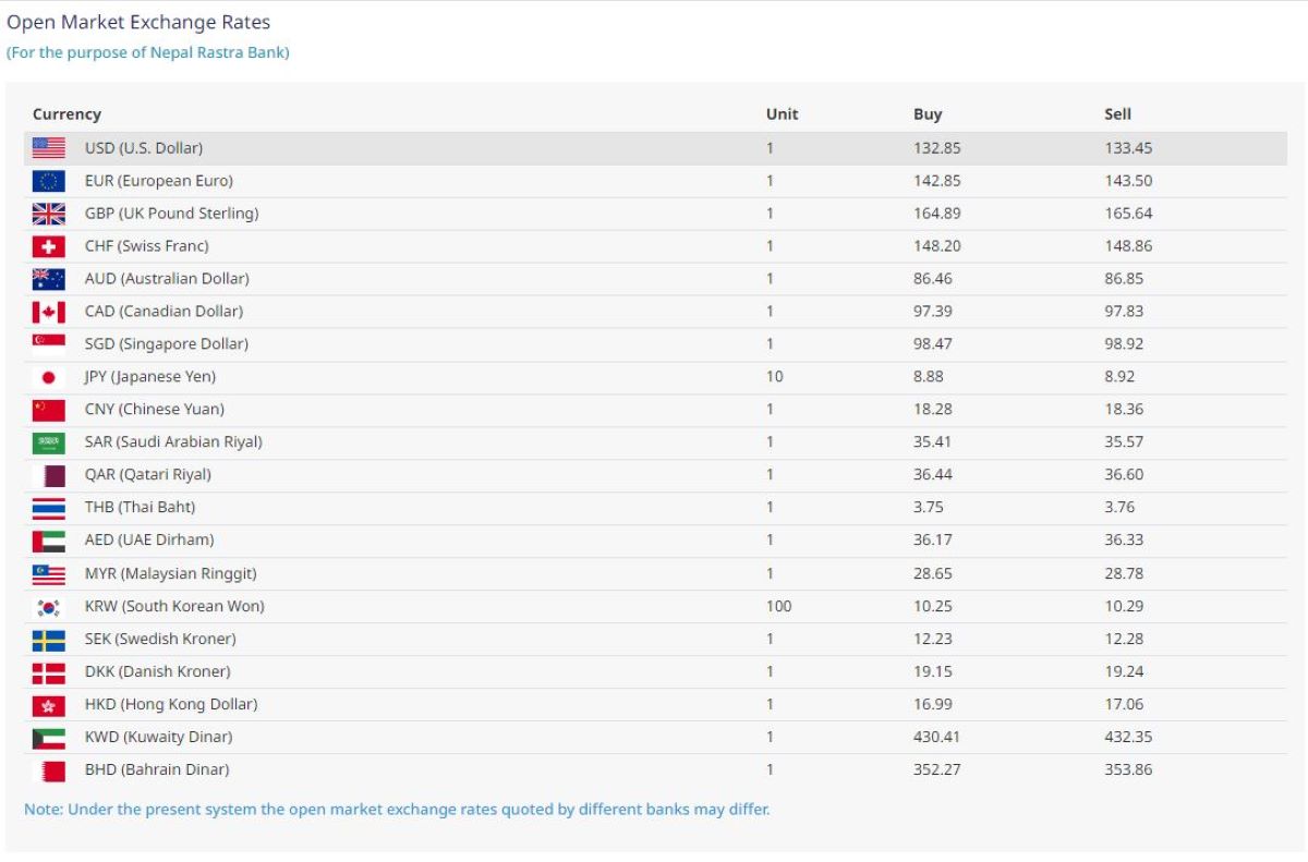 राष्ट्र बैंकले आजका लागि अमेरिकी डलरको १ को खरिद दर १३२ रुपैयाँ ८५ पैसा र बिक्री दर १३३ रुपैयाँ ४५ पैसा कायम गरेको छ भने युरोपियन युरो एकको खरिद दर १४२ रुपैयाँ ८५ पैसा र बिक्री दर १४३ रुपैयाँ ५० पैसामा कारोबारको अनुमति दिएको छ ।