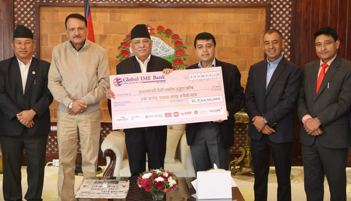 अध्यक्ष ढकालले ग्लोबल आइएमई बैङ्क लिमिटेड, आइजीआई प्रुडेन्सियल इन्स्योरेन्स, आइएमई लाइफ इन्स्योरेन्स र आइएमई लिमिटेडलगायत आइएमई ग्रुपबाट प्रवर्द्धित कम्पनी तथा आइएमई फाउन्डेसनमार्फत घोषणा गरिएको उक्त सहयोग रकमको चेक प्रधानमन्त्री दाहाललाई हस्तान्तरण गरेका हुन ।