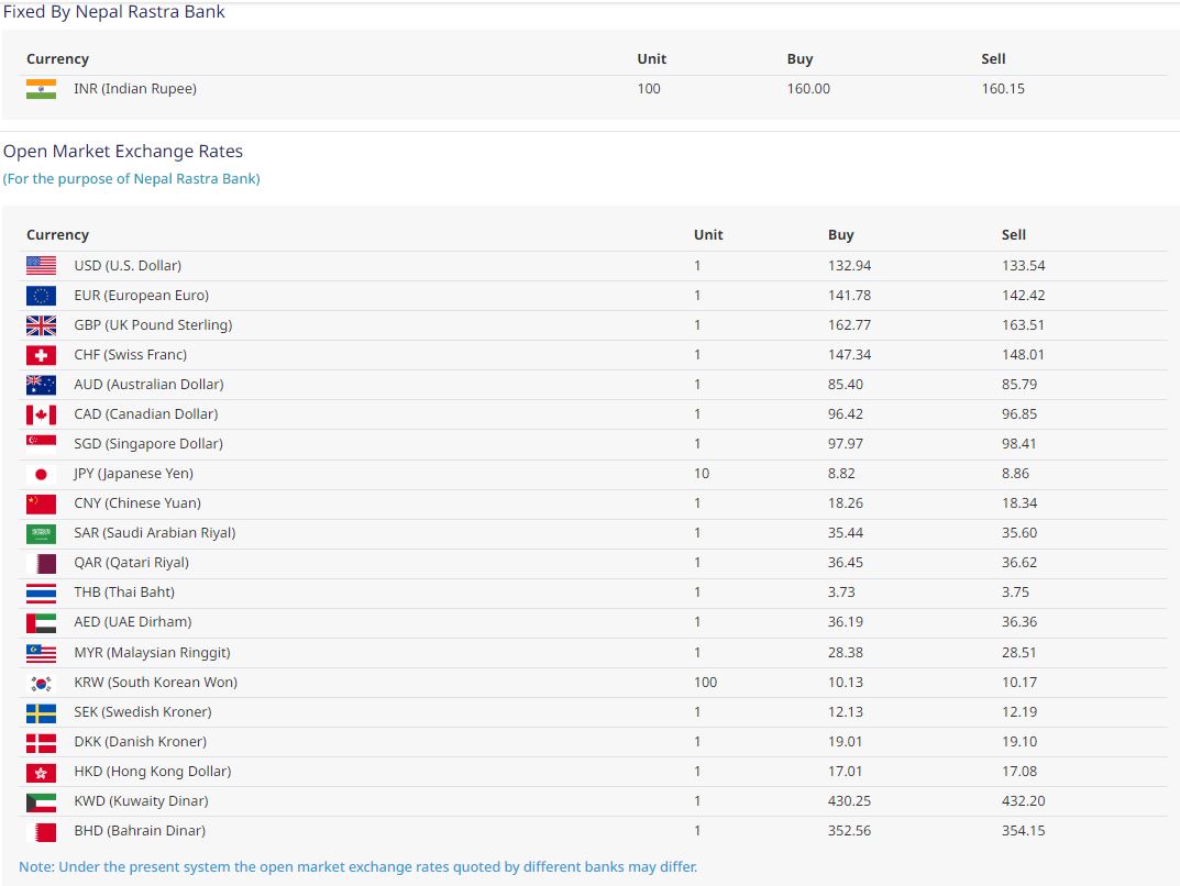 राष्ट्र बैंकले आजका लागि अमेरिकी डलरको १ को खरिद दर १३२ रुपैयाँ ९४ पैसा र बिक्री दर १३३ रुपैयाँ ५४ पैसा कायम गरेको छ भने युरोपियन युरो एकको खरिद दर १४१ रुपैयाँ ७८ पैसा र बिक्री दर १४२ रुपैयाँ ४२ पैसामा कारोबारको अनुमति दिएको छ ।
