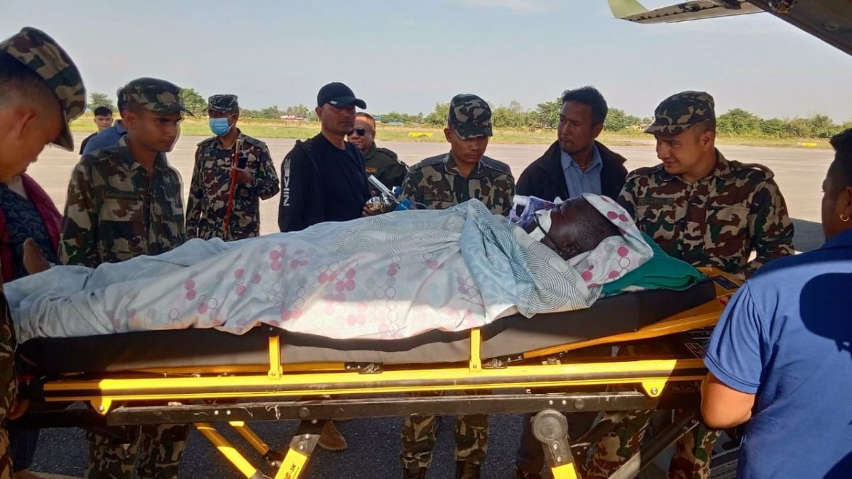 कार्कीको घरमा भएको आगलागीमा घाइते भएका १४ जनालाई सोमबार नेपाली सेनाको विमानद्वारा विराटनगरबाट काठमाडौं ल्याइएको थियो । (रासस)