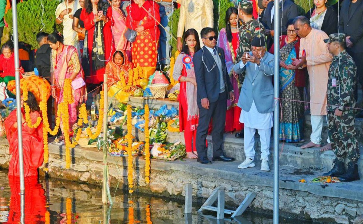त्यस्तै राष्ट्रपति पौडेलले गुह्येश्वरीमा निर्मित पूजास्थलमा अस्ताउँदो सूर्यलाई अघ्र्य दिँदै छठीमाताको पूजाअर्चना गर्नुभयो । छठ पूजाका लागि पोखरी ध्वजापताकाले सिङ्गारिनुका साथै झिलीमिली बत्ती जडान गरिएको छ ।