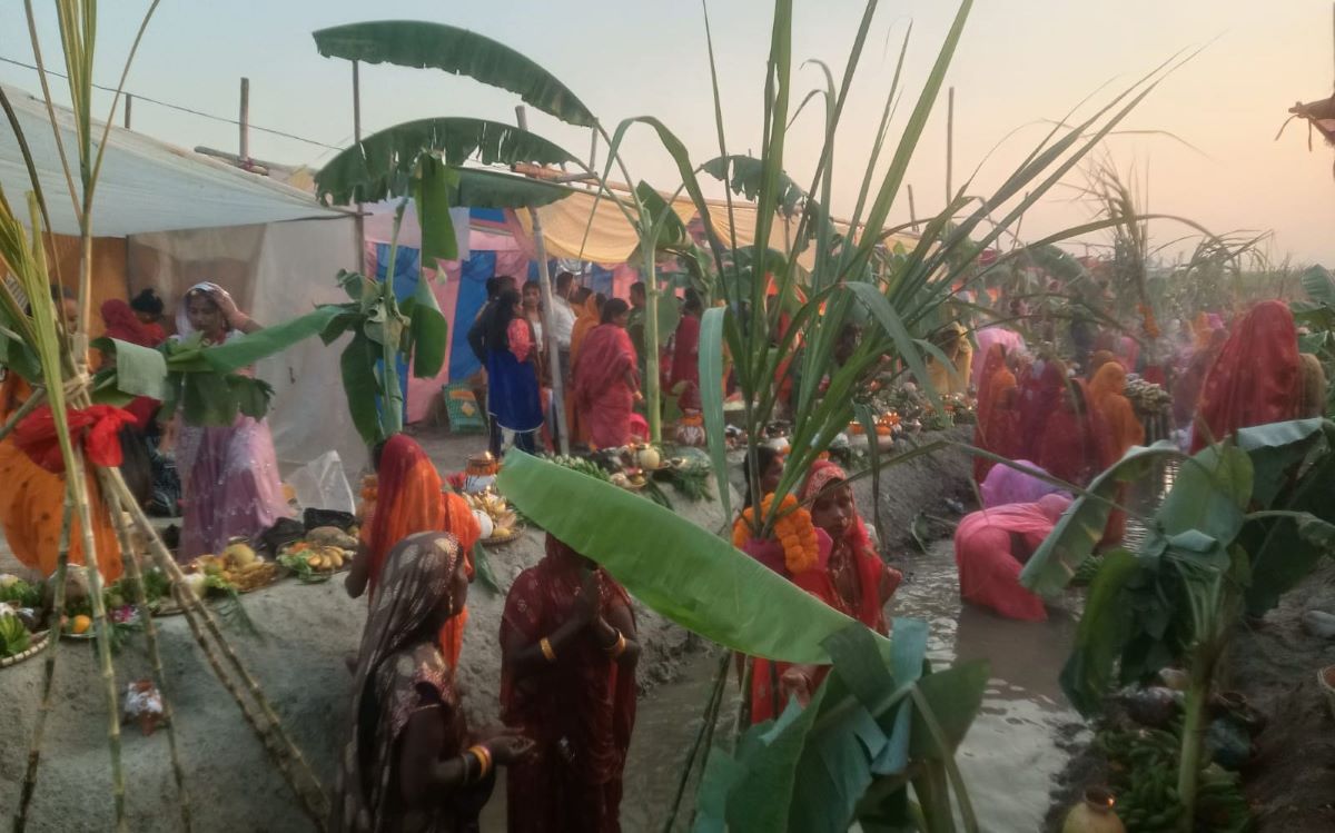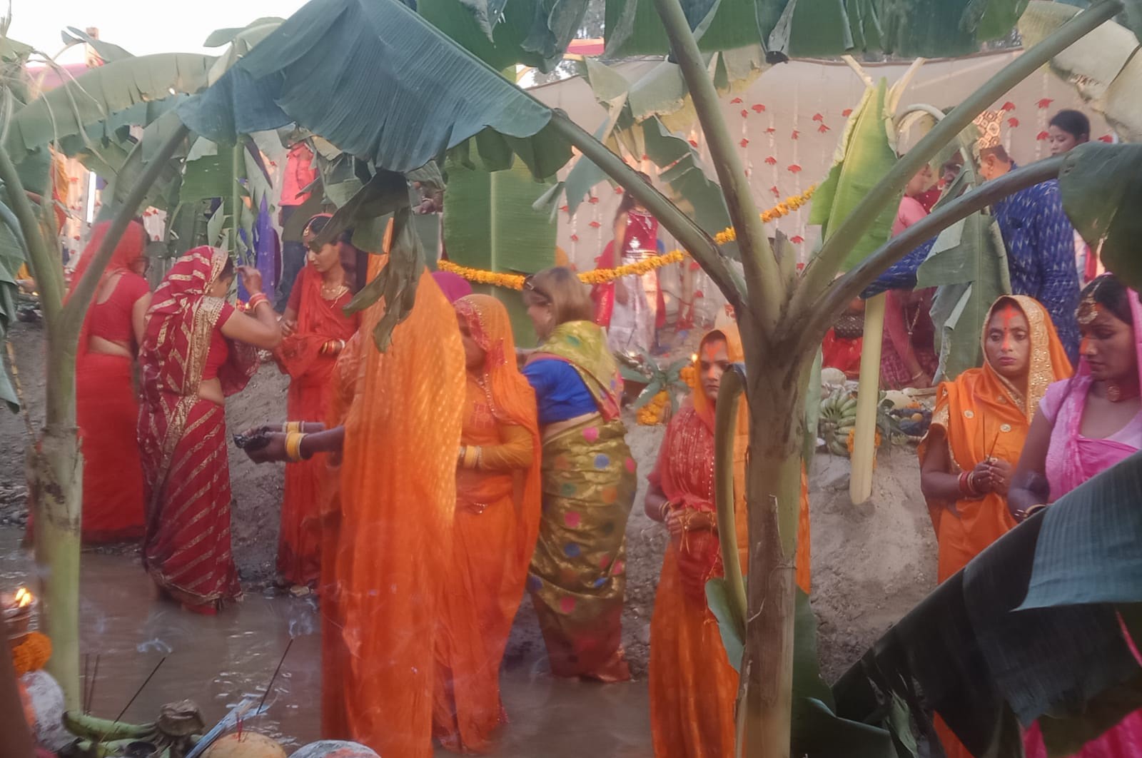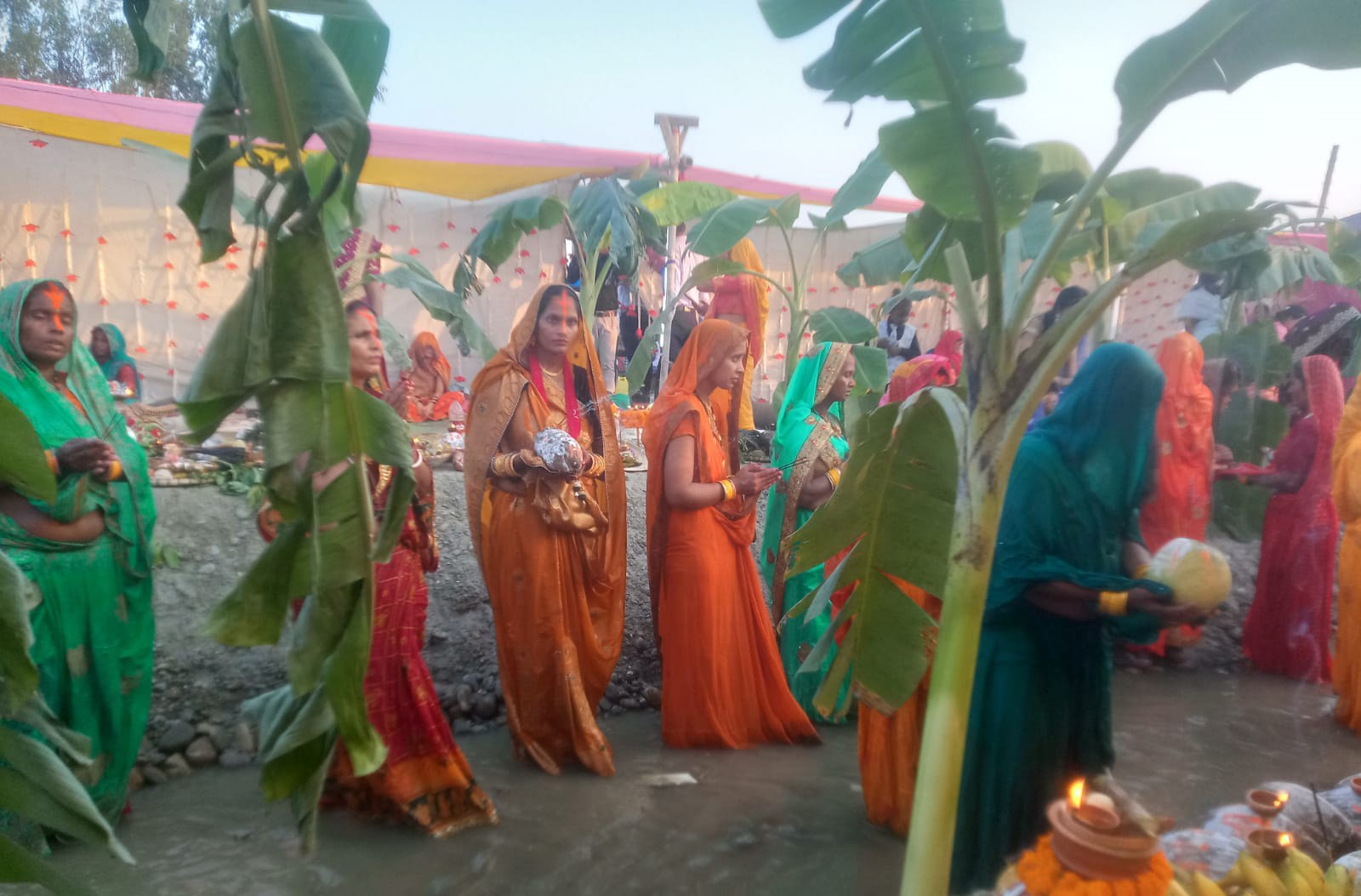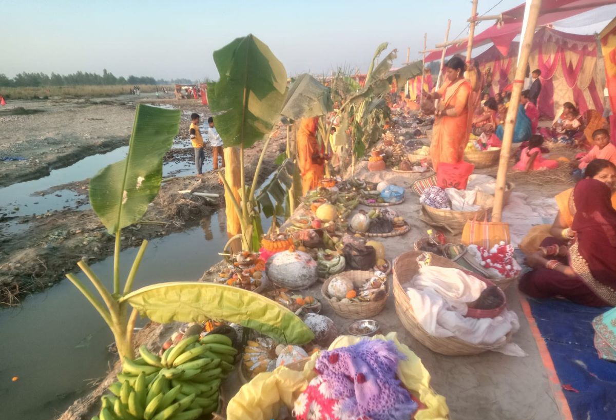 घाटको अगाडि रहेको जलभित्र पसेर व्रतालुले घरमा पकाइएको ठकुवा, भुसुवा, टिकिया, मिठाई (खाजा) फलफूल, नौवैद्य, उखु, नरियल, केरा लगायतका प्रसाद सूर्यलाई अर्घ दिइएको हो।