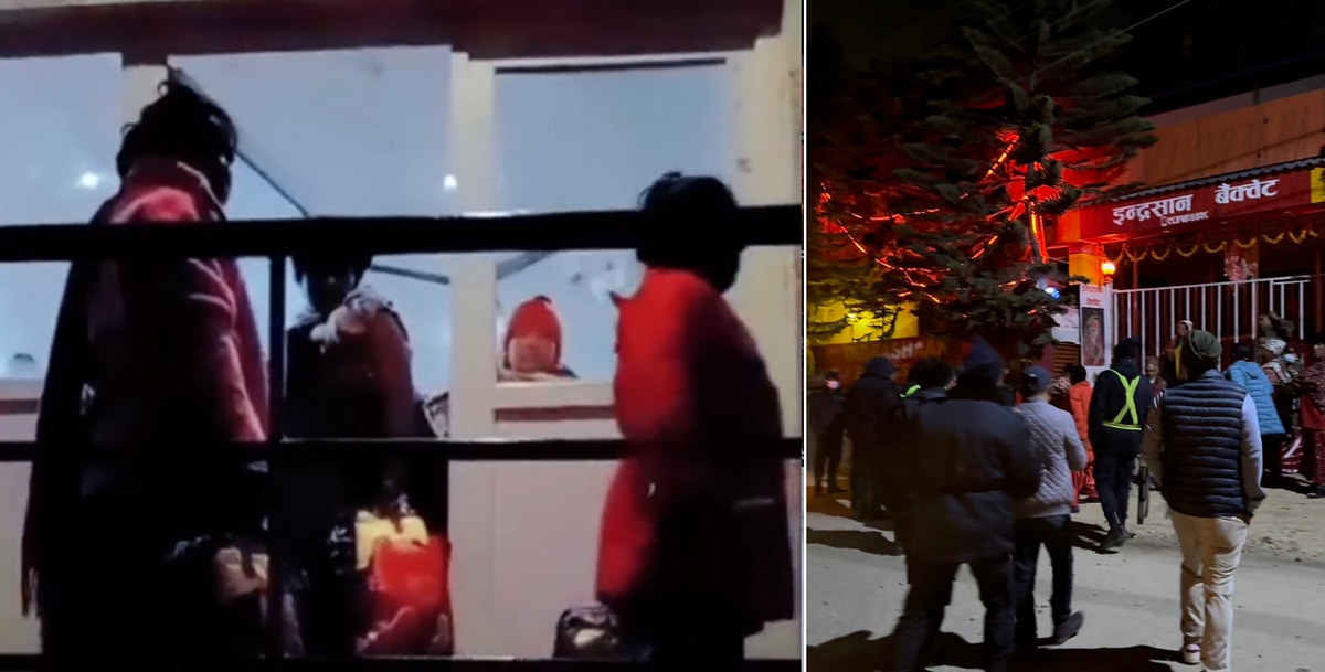 भक्तपुरको मध्यपुर थिमि नगरपालिकास्थित लोकन्थलीको इन्द्रसान पार्टी प्यालेसमा सुत्न लागेका महिलाहरूलाई मंगलबार राति १० बजेतिर निकालिएको भिडियोमा देखिन्छ ।