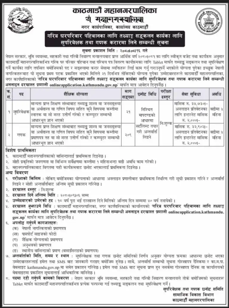 काठमाडौँ । काठमाडौँ महानगरपालिकाले करारमा २३० कर्मचारी मागेको छ। महानगरले आज सूचना प्रकाशित गरी महानगरपालिकाभित्र गरिब घर परिवार पहिचान तथा परिचय पत्र वितरणका लागि २१ सुपरीवेक्षक र २०९ गणक गरी २३० जना कर्मचारी माग गरेको हो ।