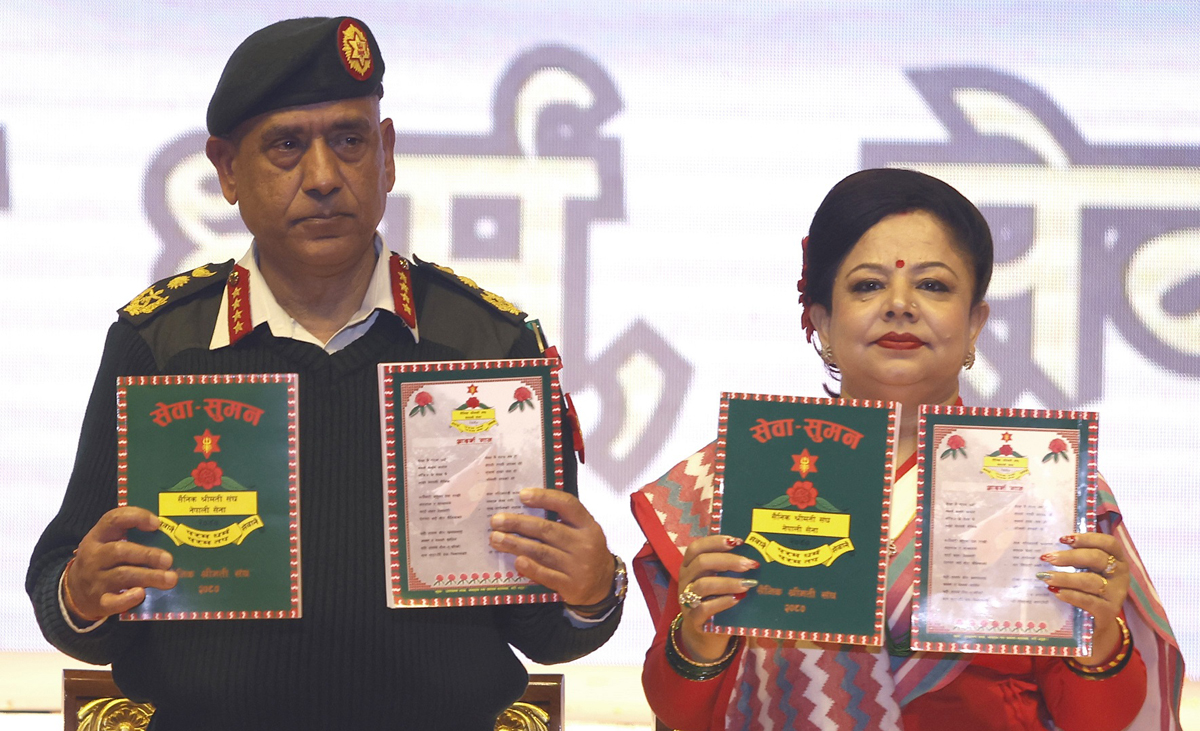 काठमाडौं । सैनिक श्रीमती संघ (नेपाली सेना) को ४० औं वार्षिकोत्सवको अवसरमा जङ्गी अड्डामा आयोजित कार्यक्रममा आज प्रधान सेनापति प्रभुराम शर्माले संघको वार्षिक मुखपत्र ‘सेवा सुमन’ को विमोचन गरेका छन् ।