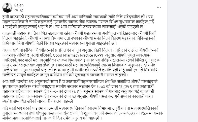 बुधबार महानगर प्रमुख बालेन्द्र शाह (बालेन)ले अनधिकृत व्यक्तिहरूबाट औषधि बिक्री भइरहेको, औषधि व्यवस्था विभागमा दर्ता नभएका औषधिसमेत बिक्री भइरहेको तथा चिकित्सकको प्रेस्किप्सनबिना औषधि बिक्री भइरहेको भन्दै २९ मंसिरभित्र कानुनी दायरमा नआउने औषधि पसल बन्द गर्ने बताएका हुन् ।