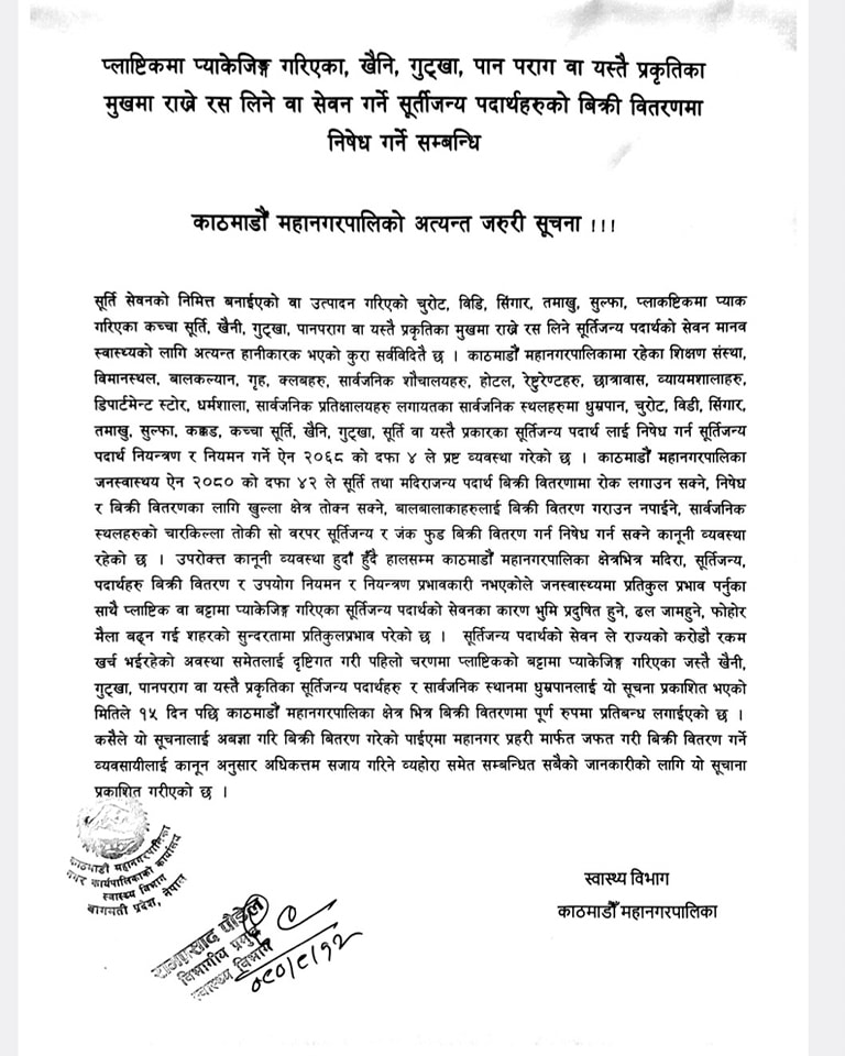 प्लाष्टिकमा प्याक गरिएका कच्चा सुर्ती, खैनी, बिँडी, तम्बाखु, सुल्फा, गुट्खा, पानपराग वा यस्तै प्रकृतिका मुखमा राखेर रस लिने सुर्तीजन्य पदार्थको भण्डारण, बिक्री र प्रयोग गर्न नपाइने बारेको सूचना महानगरपालिकाले मङ्सिर १२ गते जारी गरेको थियो ।