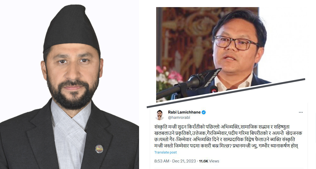 ‘संस्कृति मन्त्री सुदन किराँतीको पछिल्लो अभिव्यक्ति, सामाजिक सद्भाव र सहिष्णुता खलबलाउने प्रकृतिको, उत्तेजक, गैरजिम्मेवार, पदीय गरिमा बिपरीतको र अत्यन्तै खेदजनक छ,’ उनले भनेका छन, ‘यस्तो गैर जिम्मेवार अभिव्यक्ति दिने र साम्प्रदायिक विद्वेष फैलाउने ब्यक्ति संस्कृति मन्त्रीजस्तो जिम्मेवार पदमा कसरी बस्न मिल्छ ? प्रधानमन्त्री ज्यु, गम्भीर ध्यानाकर्षण होस् ।’