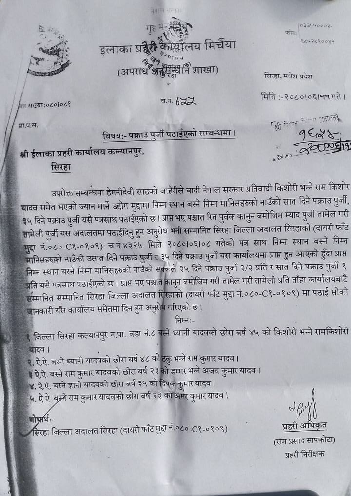 कल्याणपुर नगरपालिका ८ मझाउका हेमनी देवी शाहले ज्यान मार्ने मुद्दा दर्तापछि सिरहा जिल्ला अदालतले ३५ दिने पक्राउ पुर्जी जारी गरे पनि कसुरदारहरूलाई प्रहरीले पक्राउ गर्न आनाकानी गरेको हो।