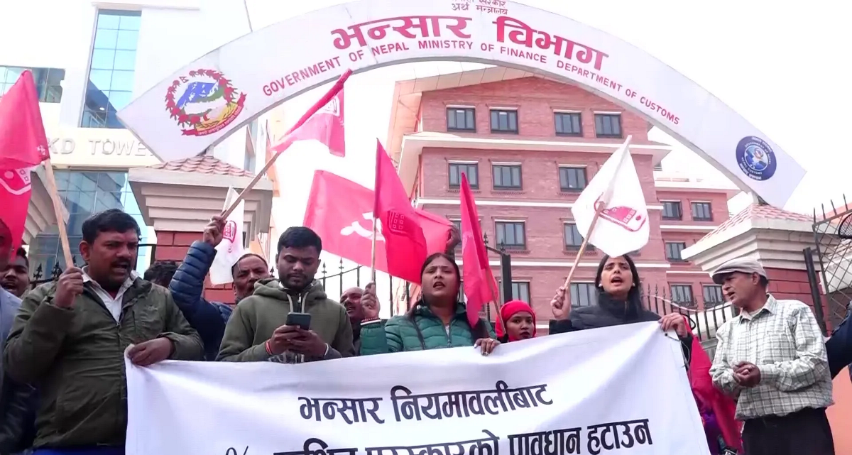 आम सम्पर्क मञ्चले ‘भन्सार नियमावलीबाट ४५ प्रतिशत कथित पुरस्कारको लुटकारी ब्यवस्था खारेजी’ गर्नुपर्ने लगायतका माग गर्दै भन्सार विभागमा धर्ना तथा घेराउ गर्दै आएको छ ।