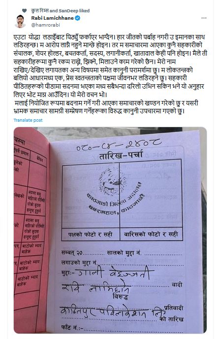 रिट दर्तापछि सामाजिक सञ्जाल फेसबुकमार्फत जानकारी दिँदै उनले लेखेका छन्, ‘एउटा योद्धा लडाइँबाट पिठ्युँ फर्काएर भाग्दैन । हार जीतको पर्बाह नगरी उ इमानका साथ लडिरहन्छ। म आरोप लाग्नै नहुने मान्छे होइन । तर म समाचारमा आएका कुनै सहकारीको संचालक, शेयर होल्डर, बचतकर्ता, सदस्य, लगानीकर्ता, खातावाल केही पनि होइन । मैले ती सहकारीहरूमा कुनै रकम राख्ने, झिक्ने, मिलाउने काम गरेको छैन । मेरो नाम राखिए/देखिए लगायतका अन्य विषयमा समेत कानुनी परामर्शमा छु । म लोकतन्त्रको बलियो आधारमध्य एक, प्रेस स्वतन्त्रताको पक्षमा जीवनभर लडिरहने छु । सहकारी पीडितहरूको पीडामा सदनमा भएका मध्य सबैभन्दा दरिलो उभिन सकिन भने यो अनुहार लिएर भोट माग्न आउँदिन। यो मेरो वचन भो । मलाई नियोजित रूपमा बदनाम गर्ने गरी आएका समाचारको खण्डन गरेको छु र यसरी भ्रामक समाचार सामग्री सम्प्रेषण गर्नेहरूका विरुद्ध कानुनी उपचारमा गएको छु ।’