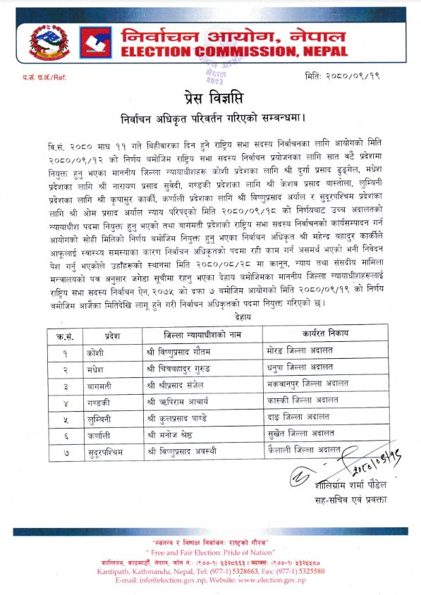 यसअघि निर्वाचन अधिकृत नियुक्त जिल्ला न्यायाधीशहरू कोशी प्रदेशका लागि दुर्गा प्रसाद ढुङ्गेल, मधेश प्रदेशका लागि नारायण प्रसाद सुवेदी, गण्डकी प्रदेशका लागि केशव प्रसाद बास्तोला, लुम्बिनी प्रदेशका लागि कृपासुर कार्की, कर्णाली प्रदेशका लागि विष्णुप्रसाद अर्याल र सुदूरपश्चिम प्रदेशका लागि ओम प्रसाद अर्याल न्याय परिषद्को १८ पुसको निर्णयबाट उच्च अदालतको न्यायाधीश पदमा नियुक्त भएका र बागमती प्रदेशको राष्ट्रिय सभा सदस्य निर्वाचनको कार्यसम्पादन गर्न नियुक्त भएका निर्वाचन अधिकृत महेन्द्र बहादुर कार्कीले आफूलाई स्वास्थ्य समस्याका कारण निर्वाचन अधिकृतको पदमा रही काम गर्न असमर्थ भएको भनी निवेदन पेश गरेकाले उनीहरुको स्थानमा बिहीबार नयाँ निर्वाचन अधिकृत नियुक्त गरिएको प्रवक्ता पौडेलले जानकारी दिए ।