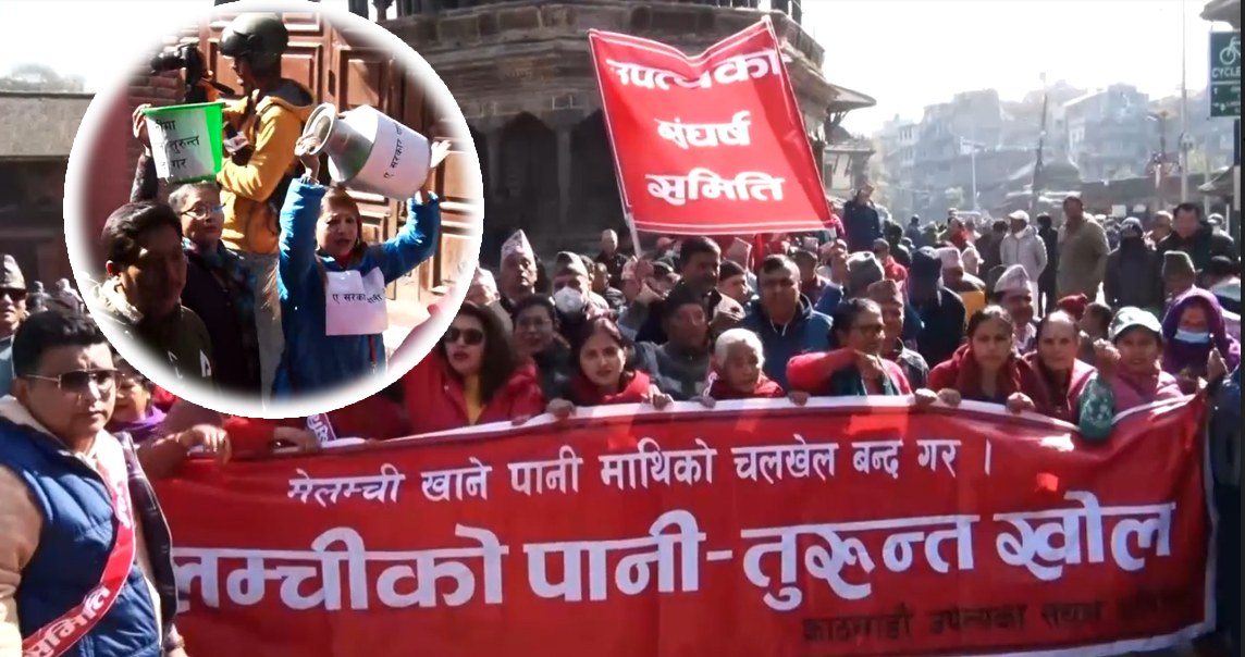 मेलम्चीको पानी तुरुन्त खोल भन्दै काठमाडौं उपत्यका मेलम्ची खानेपानी संघर्ष समिति, ललितपुरले शुक्रबार मंगलबजारदेखि लगनखेलसम्म प्रदर्शन गरेका हुन् ।