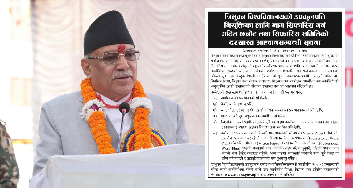 काठमाडौं । प्रधानमन्त्री एवं त्रिभुवन विश्वविद्यालयका कुलपति पुष्पकमल दाहाल ‘प्रचण्ड’ले त्रिभुवन विश्वविद्यालयले उपकुलपतिको नियुक्ति प्रक्रियाका लागि आह्वान गरेको विज्ञापनका प्रावधान सच्चाउन निर्देशन दिएका छन् ।
