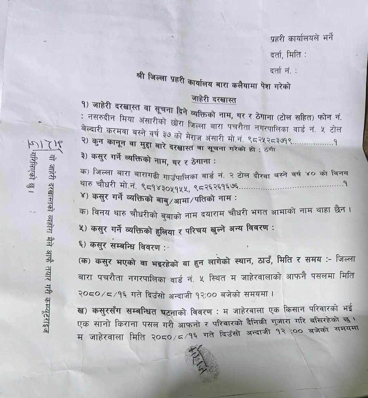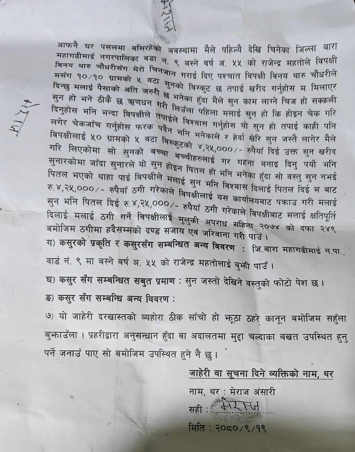 पचरौता नगरपालिका वडा नम्बर ५ बेल्दारी करमवाका ३७ वर्षीय मेराज अंसारीले आफू ठगिएको भन्दै जिल्ला प्रहरी कार्यालय बारामा जाहेरी दिएका हुन् ।