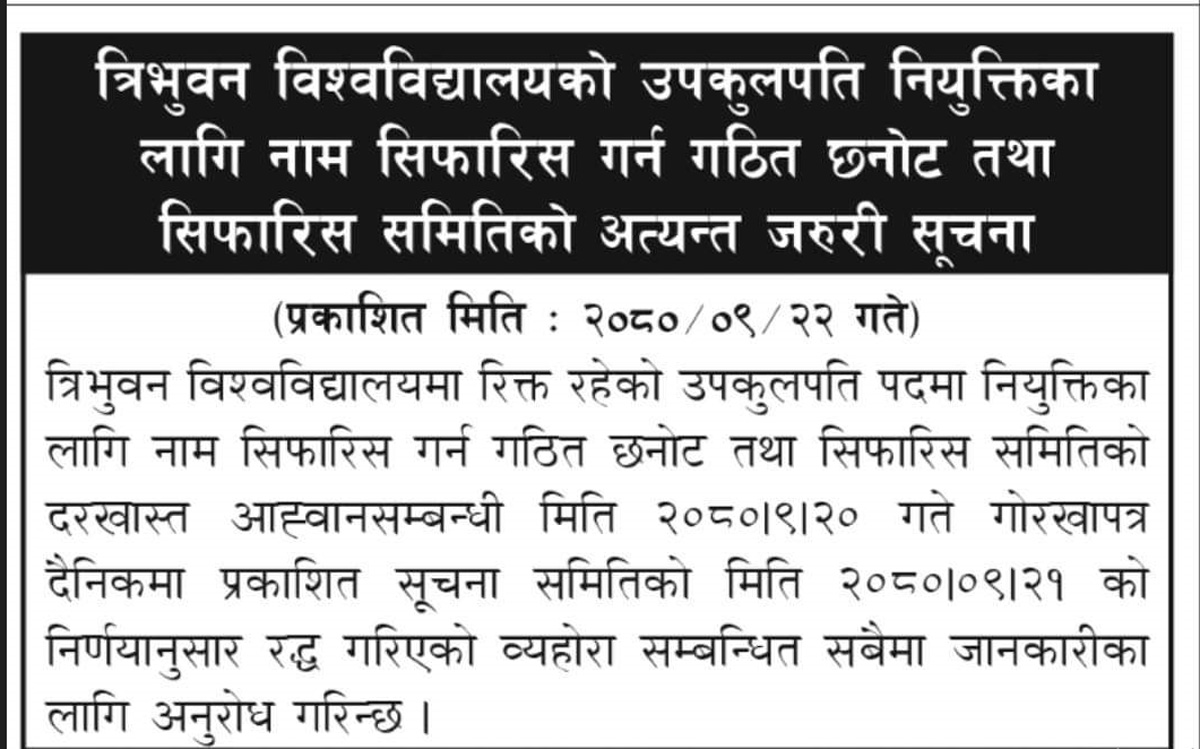 काठमाडौं । त्रिभुवन विश्वविद्यालयको उपकुलपतिका लागि नाम सिफारिस गर्न दरखास्त आह्वानको सूचना रद्द भएको छ ।