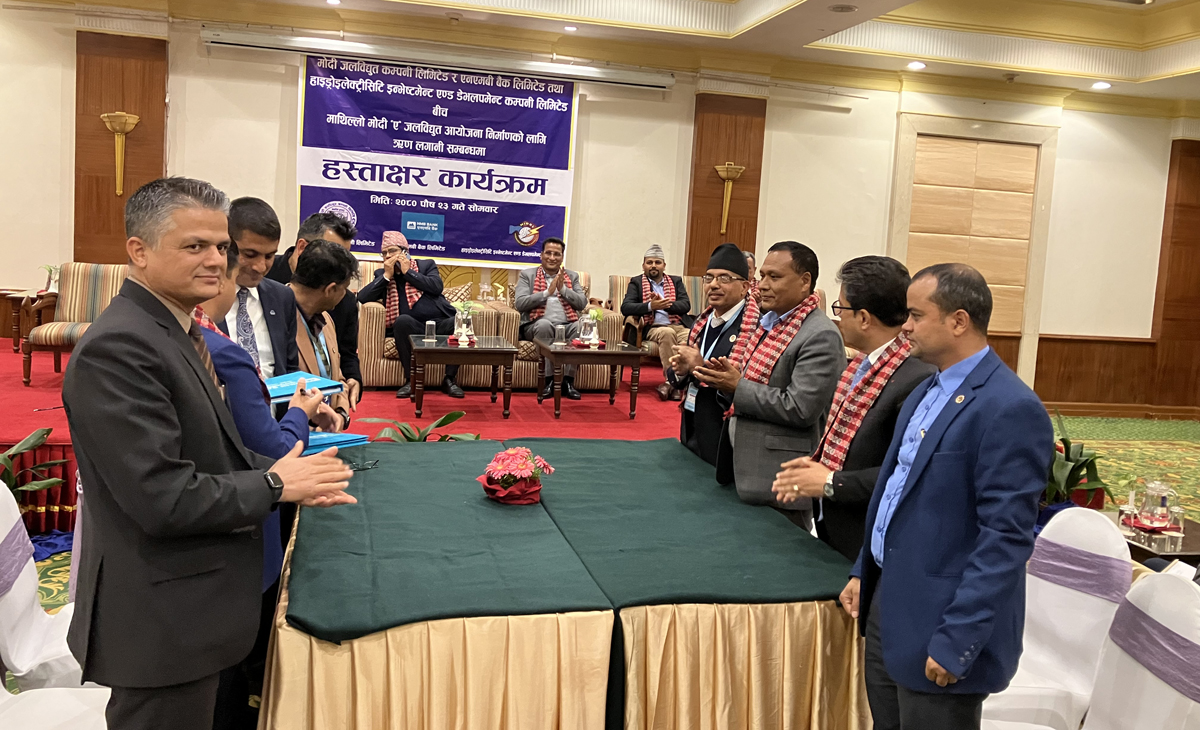 ऊर्जा, जलस्रोत तथा सिंचाइमन्त्री शक्ति बहादुर बस्नेतको उपस्थितिमा सोमबार आयोजनाको प्रवद्र्धक मोदी जलविद्युत कम्पनी लि., एनएएमबी बैैंक र एचआइडिसिएलबीच त्रिपक्षीय ऋण सम्झौतामा हस्ताक्षर भएको छ ।