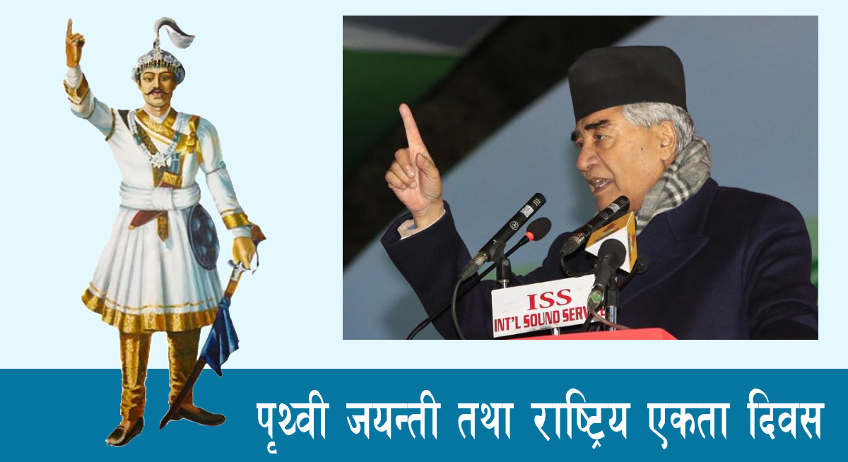 ‘आधुनिक नेपालको एकीकरण गर्ने राजा पृथ्वीनारायण शाहको स्मरणमा आज उहाँको ३०२ औं पृथ्वी जयन्ती तथा राष्ट्रिय एकता दिवस मनाइदैछ,’ देउवाले आफनो शुभकामना सन्देशमा भनेका छन, ‘यो अवसरमा उहाँप्रति हार्दिक श्रद्धाञ्जली अर्पण गर्दै त्यो कालखण्डमा जो जसले सहादत दिनु भयो ती सबैलाई आजको मितिमा बिशेष श्रद्धा साथ स्मरण गर्न चाहन्छु ।’