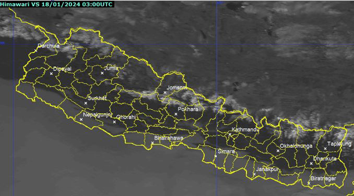 राती भने देशका पहाडी भू-भागमा आंशिक रही बाँकी भू-भागमा मौसम मुख्यतया सफा रहनेछ। कोशी, गण्डकी र कर्णाली प्रदेशका उच्च पहाडी तथा हिमाली भू-भागका एक दुई स्थानमा हल्का हिमपातको सम्भावना रहेको छ ।