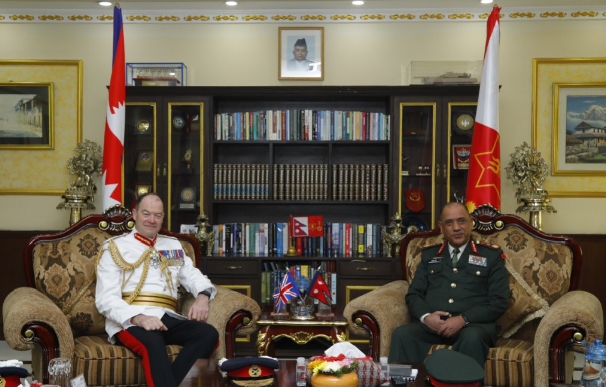 काठमाडौं । नेपाल भ्रमणमा रहेका बेलायती सेनाप्रमुख प्याट्रिक सान्डर्स र प्रधानसेनापति प्रभुराम शर्माबीच मंगलबार भेटवार्ता भएको छ।