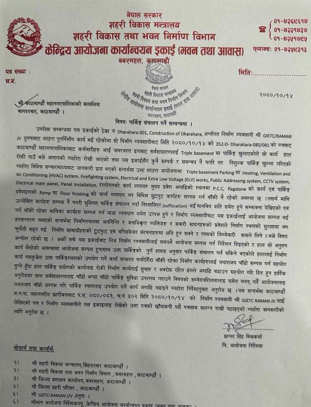 शहरी विकास मन्त्रालयले समन्वय नै नगरी निर्माणाधीन धरहराको बेसमेन्टमा पार्किङ गराएको भन्दै महानगरपालिकाको ध्यानाकर्षण गराएको थियो । केही दिन अगाडि त्यहि ठाउँमा सर्वसाधारणका लागि पार्किङ खुला गर्दा मन्त्रालयले भनेको छ – ‘धरहरा निर्माण हुदैछ । पार्किङ बन्द गर्नु ।’
