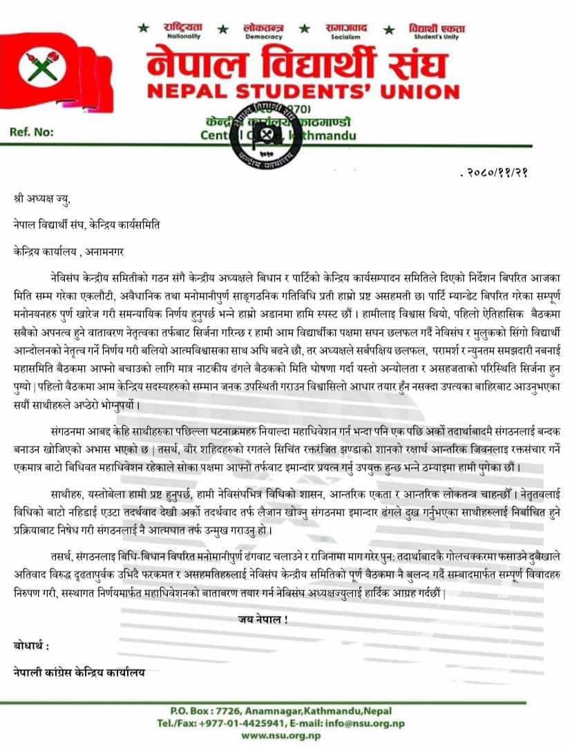 महाधिवेशन गर्नका लागि गठन गरिएको अहिलेको समितिले महाधिवेशन नै गर्ने आधार नदेखेकाले बैठकमा सहभागी हुनु औचित्य नठानेर बैठकमा नगएको उनीहरूको भनाइ छ। असन्तुष्ट पक्षले अध्यक्ष शेर्पाले दुई वर्षको अवधिमा सहयात्रीहरूसँग समन्वय नगरेको, एकलौटी कार्यशैली देखाएको कार्यसम्पादन र पार्टीको नीति निर्देशन अनुसार काम नगरेको लगायतका आरोप लगाएको छ। उनीहरूले देशभरका विद्यार्थीहरूको भावना अनुसार संगठनलाई सामूहिक नेतृत्वका साथ सञ्चालन गर्न माग गरेका छन्। नेविसंघमा तदर्थवाद वा मनोनितको प्रवृत्ति अन्त्य गर्दै निर्वाचनबाट नेतृत्व चयन गर्ने प्रक्रिया मातहतका समितिहरूमा पनि तत्काल अवलम्बन गर्न माग गरेको अर्का केन्द्रीय सदस्य पवन आचार्यले जानकारी दिए।