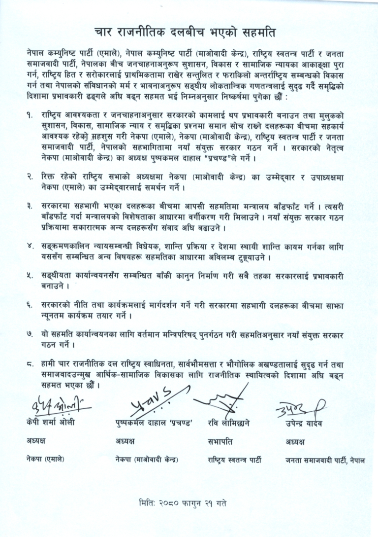 बालुवाटारस्थित प्रधानमन्त्री निवासमा नेकपा एमाले, नेकपा माओवादी केन्द्र, जनता समाजवादी पार्टी नेपाल, राष्ट्रिय स्वतन्त्र पार्टीबीच भएको बैठकमा ८ बुँदे सहमति भएको हो ।