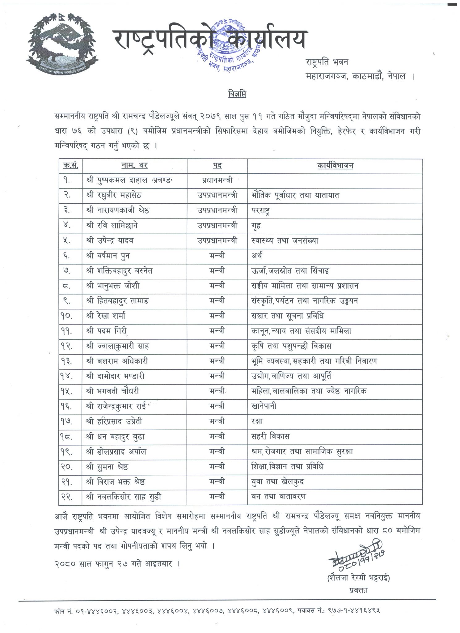 काठमाडौं । प्रधानमन्त्री पुष्पकमल दाहाल ‘प्रचण्ड’ ले मन्त्रिपरिषद् विस्तार गरेका छन् । आज जनता समाजवादी पार्टीबा उपेन्द्र यादव उपप्रधानसहित स्वास्थ्य तथा जनसंख्या मन्त्री र नवकिशोर शाह वनमन्त्री नियुक्त भएका हुन् ।
