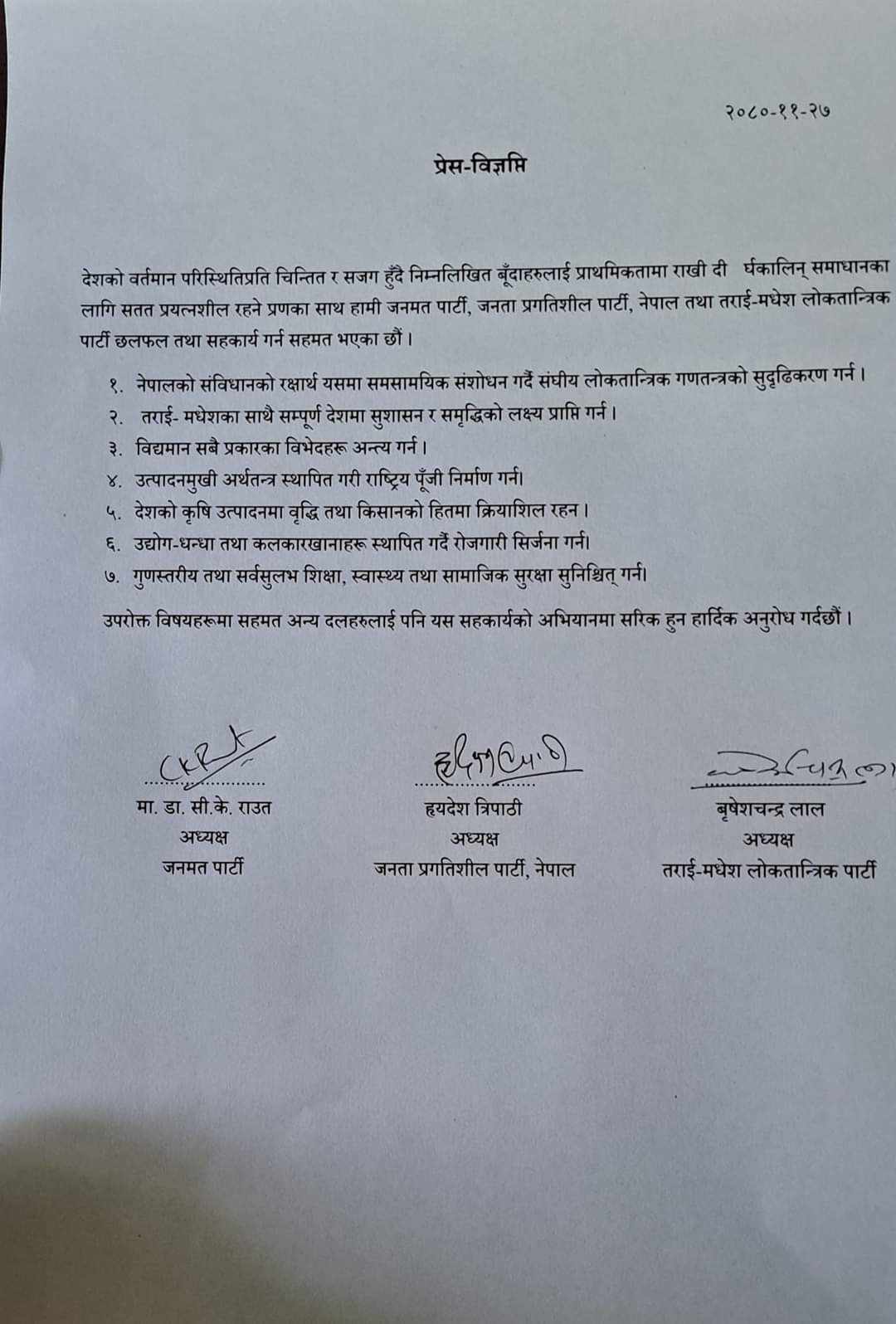 जनमत पार्टीका अध्यक्ष सीके राउत, जनता प्रगतिशील पार्टी, नेपालका अध्यक्ष हृदयेश त्रिपाठी र तराई मधेश लोकतान्त्रिक पार्टी (तमलोपा)का अध्यक्ष वृषेशचन्द्र लालले सहमतिमा हस्ताक्षर गरेका छन्। आइतबार भएको सातबुँदे सहमतिमा संविधान संशोधन गरी संघीय लोकतान्त्रिक गणतन्त्रको सुदृढीकरणका लागि सहकार्य गर्ने सहमति भएको उल्लेख छ।