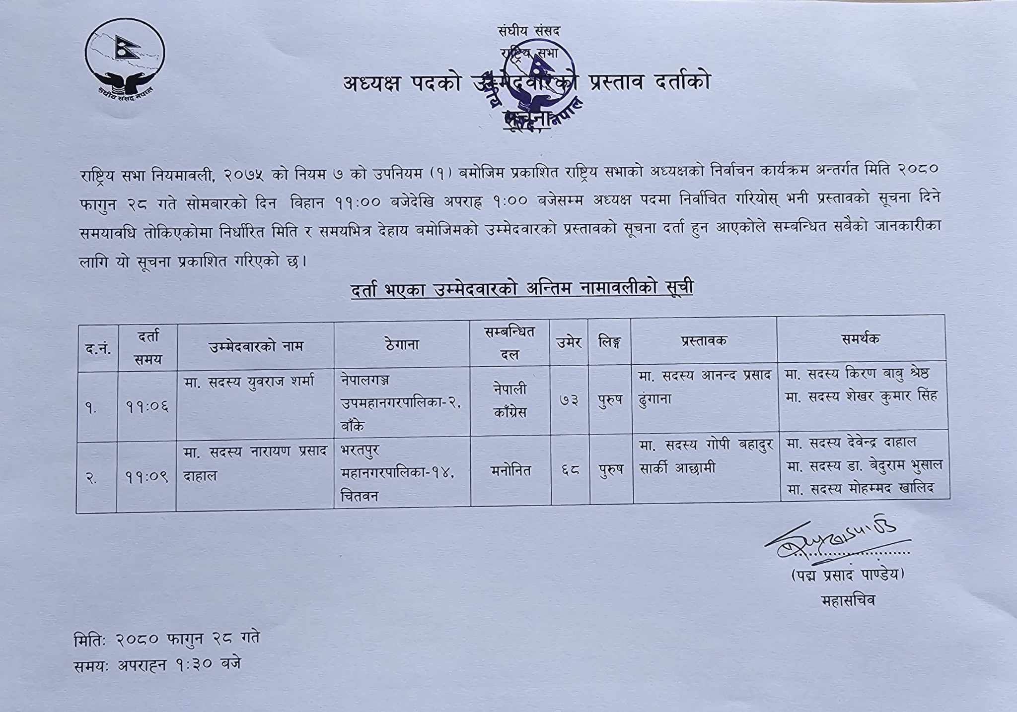 संसद सचिवालयका अनुसार सत्ता पक्षको तर्फबाट राष्ट्रिय सभा अध्यक्षको उम्मेदवार नारायण दाहाल र प्रतिपक्षीवाट युवराज शर्माले आफ्नो उम्मेदवारी दर्ता गरेका थिए । जसअनुसार अन्तिम नामावली प्रकाशित गरिएको सचिवालयले जनाएको हो ।