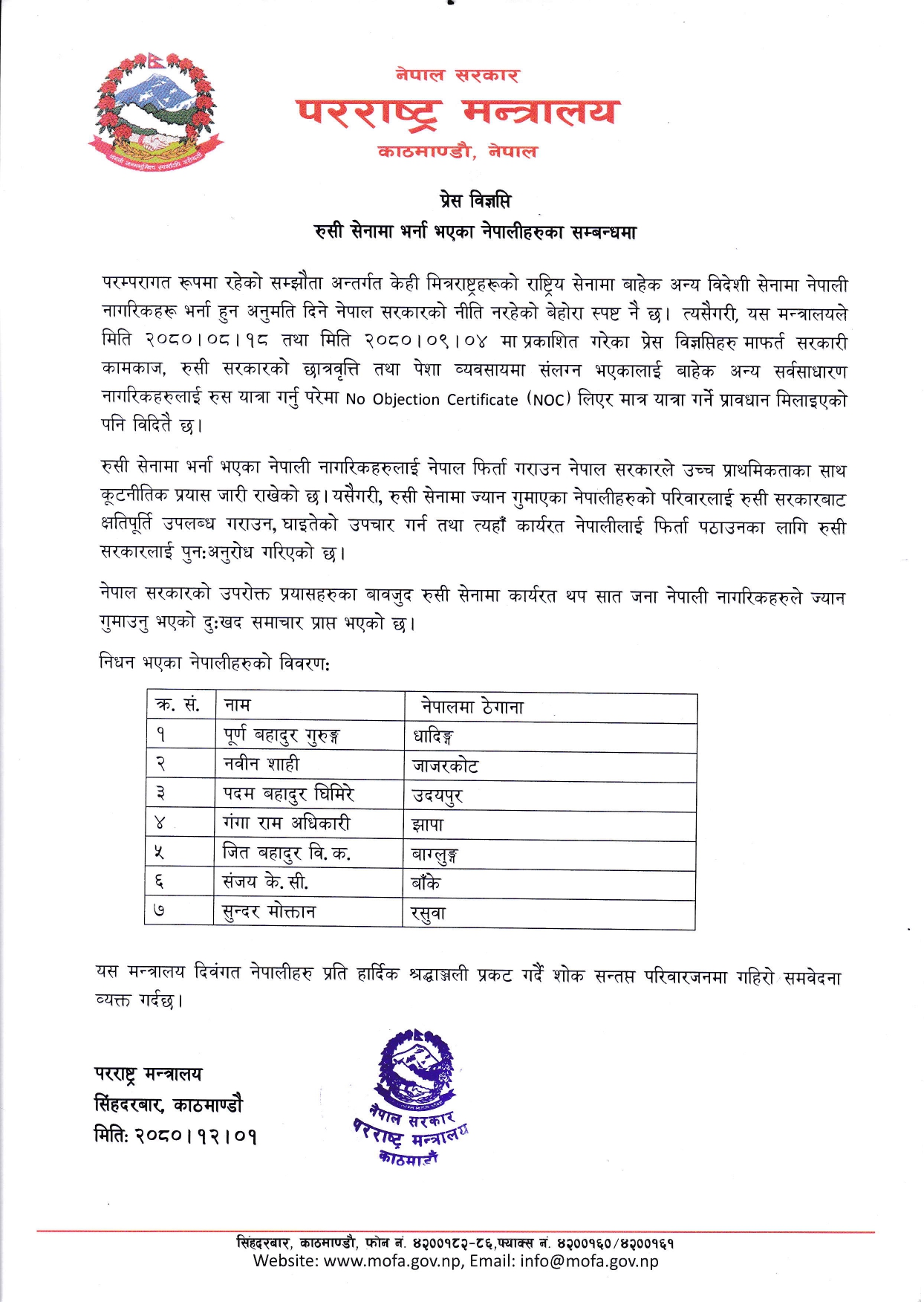 परराष्ट्र मन्त्रालयले बिहीबार विज्ञप्ति जारी गरेर थप ७ जना नेपालीको मृत्यु भएको पुष्टि गरेको छ।