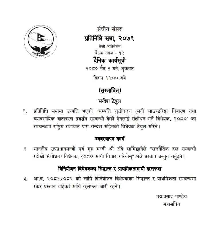 साथै, आ.ब. २०८१÷८२ को लागि बिनियोजन बिधेयकका सिद्दान्त र प्राथमिकता सबन्धमा (कर प्रस्तावबाहेक) माथी छलफल जारी रहने महासचिव पदमप्रसाद पाण्डेयले जारी गरेको सम्भावित कार्यसुचीमा उल्लेख गरिएको छ ।